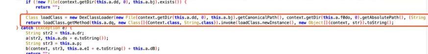 Android应用程序必须在AndroidManifest.xml文件中声明其使用的服务、广播接收器和活动组件才能使用它们。在反编译Cerberus恶意样本中很明显能看到其使用的服务、广播接收器和活动等组件并不在主dex文件中,所以这里基本可以判断其核心dex文件是在内存中动态解密的。