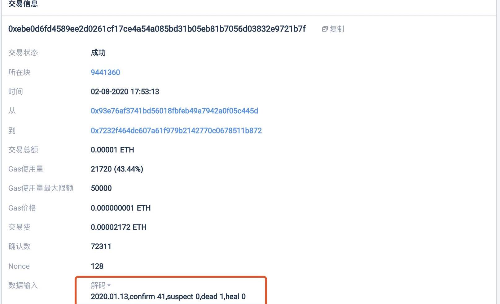 6e6669726d2034312c7375737065637420302c6465616420312c6865616c2030。我们点击切换为解码,即可看到,留言为2020.01.13,confirm41,suspect0,dead1,heal0。此留言记录了2020年1月13日的新冠肺炎疫情数据:41人确诊,0人疑似,1人死亡,0人治愈。