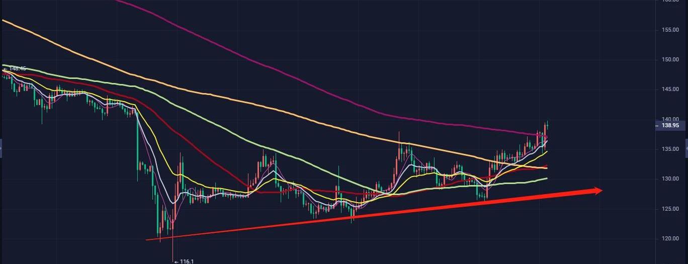 ETH:以太坊的走势是一个很标准的通道上涨,目前在140上方的压力很大,从短线来看需要看日内这个回调走势怎么走,并且着重关注135.5这个点位,维持多方强势的点位是回调需要在这个点之上或者在这个点位附近止跌为好。