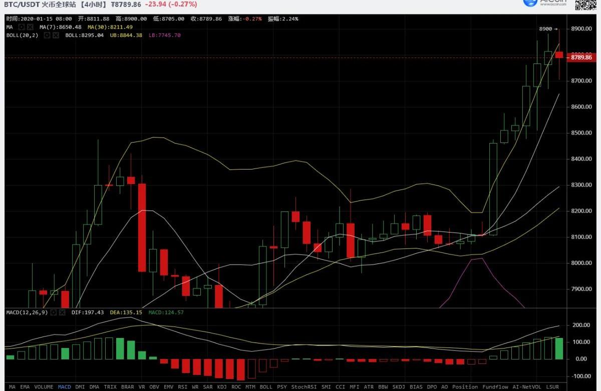 从四小时图来看走势已经连续六连阳,且都有打破布林带上轨阻力,各均线呈多头排列,布林带开口姿态,说明多头情绪浓重,后续还是向上的机会。目前价格在8780位置附近,走势处于高位回落整理,下方五日均线多次回落都未被打破.