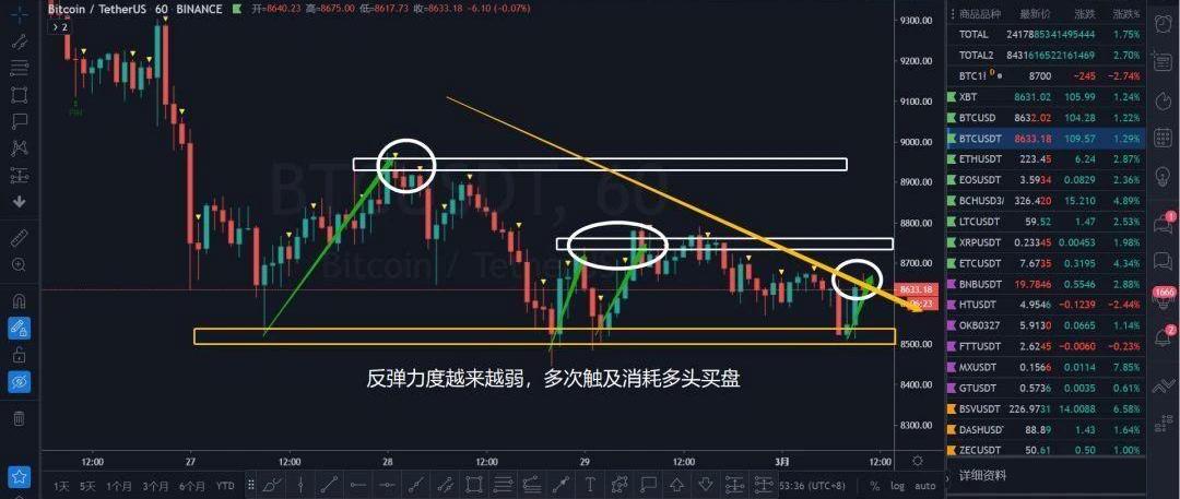 上面说了,目前行情是在一个相对低位的震荡收敛行情,可以关注三角收敛上沿的位置,参考价格8734,上方比较合理的关键开空位置在9000、9200,不放量突破9200我都不太会考虑趋势反转的可能