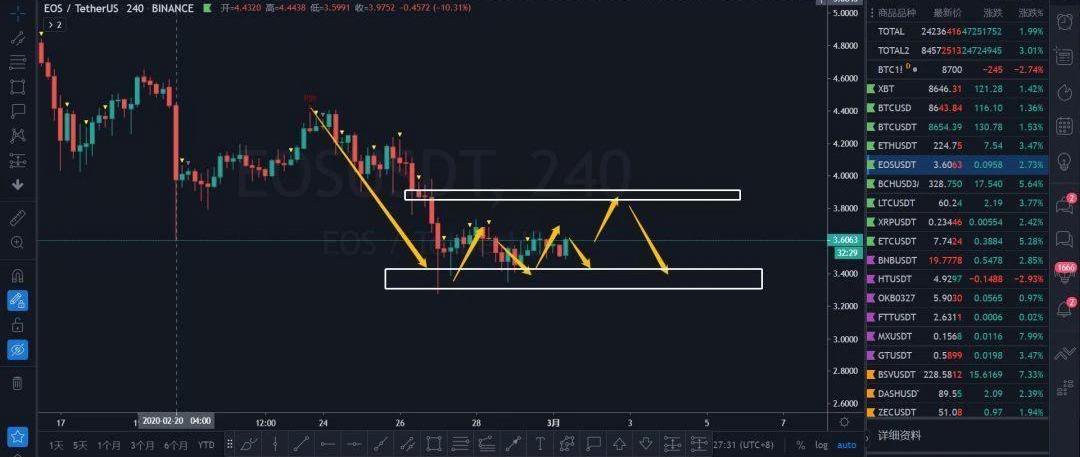 3.1策略:3.7-3.37的低位震荡,在此区间高抛低吸即可,如果上破3.7后关注关键颈线位3.81的表现,如果反攻力量不足继续介入做空即可