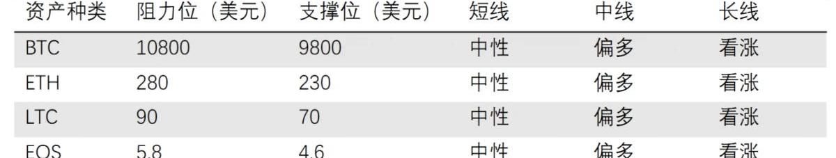 BTC长期趋势转好,未来一至两年有望迎来疯牛行情。智能合约平台龙头ETH、山寨币龙头LTC、DPoS龙头EOS可逢低配置。