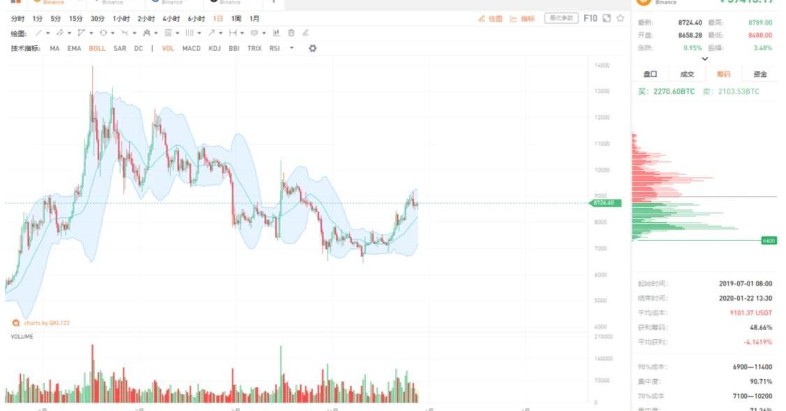今日凌晨BTC突然向下触及8500美元后,又迅速被拉回,目前在8700美元震荡。从目前筹码分布来看,筹码多集中在7200美元左右,其次是在8000美元和10000美元左右。整体上看,下方支撑比较强,但上方10000美元也有较大的抛压,后续震荡完毕后延续多头的可能性较大。