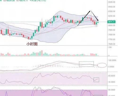 小时间线MACD又似形成金叉,且多头放量,动能较充足,RSI及KDJ均拐头向下又立马转头,MA7日均线也开始处于下行状态。目前价格受小时线下轨支撑,受中轨压制,日内整体维持在8000上方盘整,重点关注下方8000一线,若大空来袭8000必然不保。