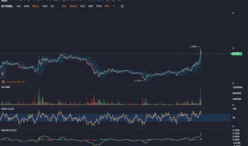 EOS相对表现继续强势,从昨日3.3美元最高拉升至4.0美元附近,释放的量能较为明显,短时被空军压制,回踩3.6美元。