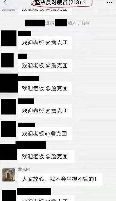 随后,詹克团进入了公司内部反对裁员群,大家一阵欢迎。