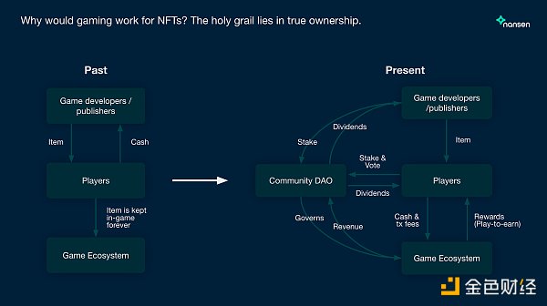 艺术 NFT 是受到主流关注的用例,然而,就销量而言,有一个收藏品超过了所有艺术 NFT 收藏品。 NFT 游戏 Axie Infinity 目前占据桂冠(不包括 LooksRare 上的清洗交易)。 NFT 技术与游戏的结合催生了一种新的游戏范式:Play-To-Earn/Play-And-Earn/GameFi。
