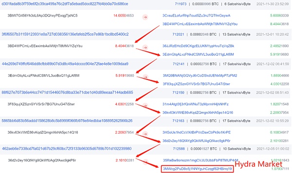 从上图可以看到,资金被转移到两个地址,接着两个地址分别又转到另两个地址,数额越来越小,出现的地址也越来越多,只至最后有部分资金通过 wasabi 混币转出或转到 Hydra Market 暗网市场。当然,这还只是一小部分的资金流向,但我们不难看出,为了躲避追踪,黑客非常有“耐心”。