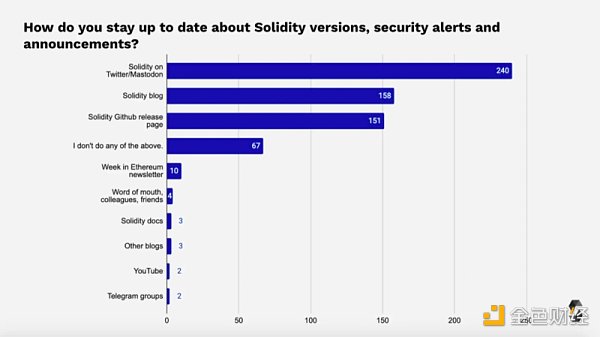 不到 20% 的受访者曾参与过与 Solidity 语言设计相关的工作,6.2% 参加了 Solidity 论坛的讨论,5.1% 参加了语言设计电话会议,6.4% 在 Solidity 存储库中打开或贡献了 Github 问题。
