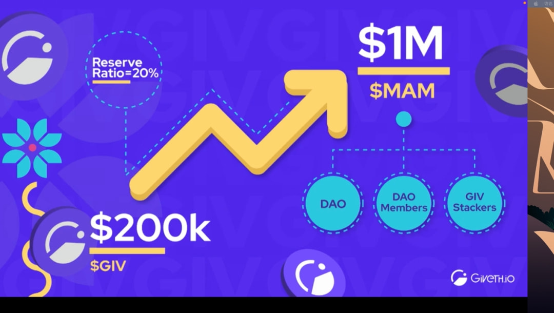 Gurves的一切都是为了尝试去创建一个能够使人们拥有自己的经济体系的系统。一旦一个DAO拥有了自己的名誉系统,比如Mutual Aid Mondays,他们其实已经开始分发代币,他们知道如何去DAO。这时我们就可以开始将钱投入到其中,因为=他们已经知道如何通过名誉系统去管理捐款,我们就可以让他们创造自己的经济系统,这就需要用到Gurves以及GIVpower。所以,如果说Mutual Aid Mondays项目上已经通过GIVpower抵押了20万。我这里不会去解释联合曲线,但其实Gurves就是一个有着Giveth代币的联合曲线抵押。我就解释下留存比率,这里我们选择了20%D额留存比率,这主要是因为TEC给他们的DAO选择了20%, 我本人也很信任代币工程师的建议。所以说如果Mutual Aid Mondays选择了20%的留存比率,那么他们的市值将会是100万,这是因为留存比率本质上就是抵押除以市值。也就是说,我们可以用20万美元的Giveth代币抵押来创造100万美元的市值的Mutual Aid Mondays的代币。