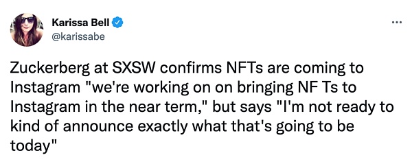 知名电子科技博客 Engadget 上的高级编辑 Karissa Bell 在推特上表示:马克·扎克伯格进军 NFT 领域,正努力在短期内将 NFT 引入 Instagram,其上用户可以自主铸造自己的 NFT。