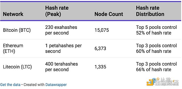 工作量证明区块链,例如比特币,由用户和节点组成——包括非挖矿和挖矿。这些网络的去中心化和安全性在很大程度上取决于它们的哈希率有多高以及哈希率分布在多少个实体中。 PoW区块链的哈希率代表矿工为网络提供的累积处理能力。 哈希率越高,破坏起来就越困难。