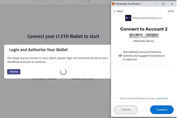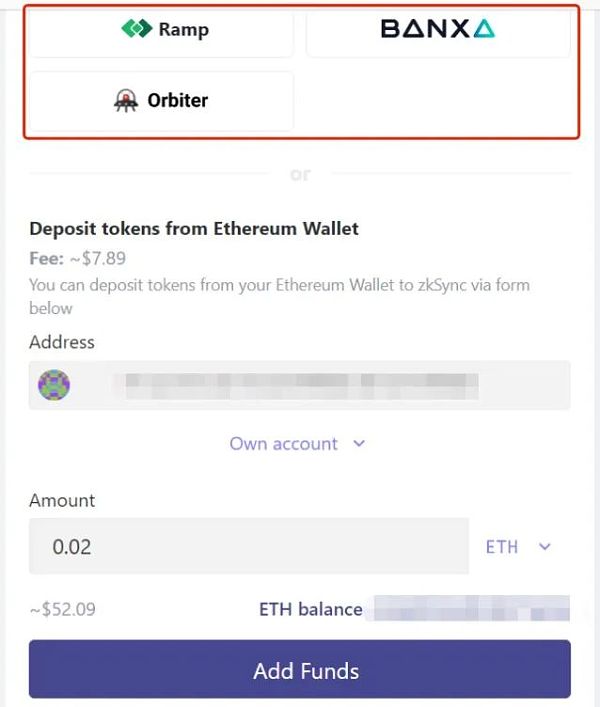 连接完毕后,由于我们在 zkSync 这个二层网络里面没有资金,所以需要点击+ Add Funds,把准备好的 ETH 存进二层网络。