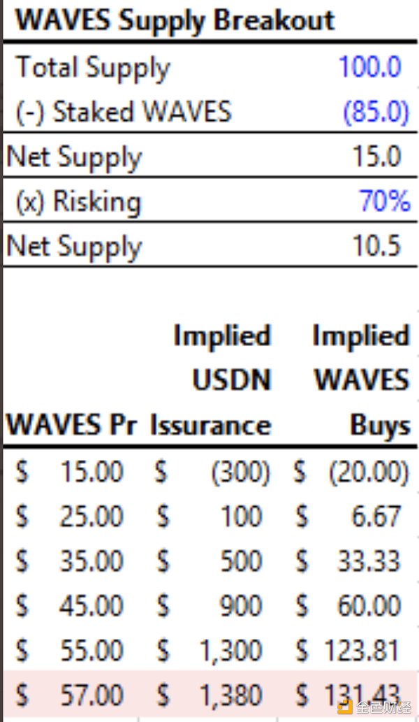 由于价格暴涨,WAVES 创造了更多的 USDN 发行能力。假设目标值是 2.5 倍,WAVES 就可以多发行 13.8 亿 USDN。