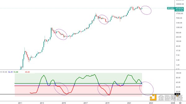 对于2018年熊市,随机指数破位后BTC同样出现大幅度调整,前期缓跌后期加速,直至跌至大底区域见底,2020年312期间,该指数跌破见红,这次下跌幅度也是比较大,所以后面不排除反弹后再次回落的可能。