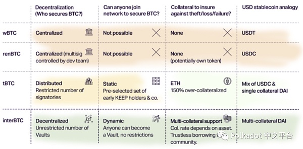 InterBTC 是一种去中心化且无需信任的 BTC 挂钩衍生品。任何人都可以成为 InterBTC(去中心化)中的保险库,保险库不能阻止用户铸造 InterBTC(抗审查),保险库将抵押品锁定在不同的资产中(资本效率),如果 BTC 丢失或被盗,用户将获得抵押品以优惠利率偿还 (不信任)。