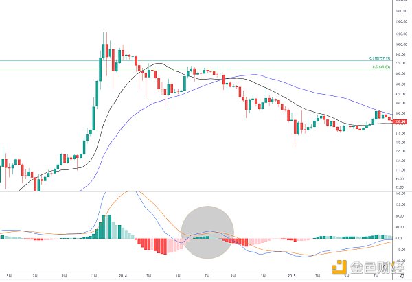 2014年熊市,BTC在回落过程中迎来周线级别的反弹,同样MACD金叉,不过反弹未能突破上方0.5-0.618压力带,后面价格再次回落探底。