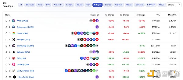 扩展到 Polygon 的 DeFi 应用中 DEX 最多,除前面介绍过的 Polygon 原生 DEX QuickSwap,还有很多熟悉的应用,锁仓量排名前十的有 Curve、SushiSwap、Balancer、Uniswap 、Synapse 、Dfyn Network、ApeSwap、DODO、KyberSwap 等。