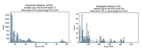 多模态分布则在更大的区间内出现几处凸起和峰值。我们的抽样中约 20% 的 NFT 系列呈现这种情况。示例包括 VeeFriends、Autoglyphs 和 FLUF world。