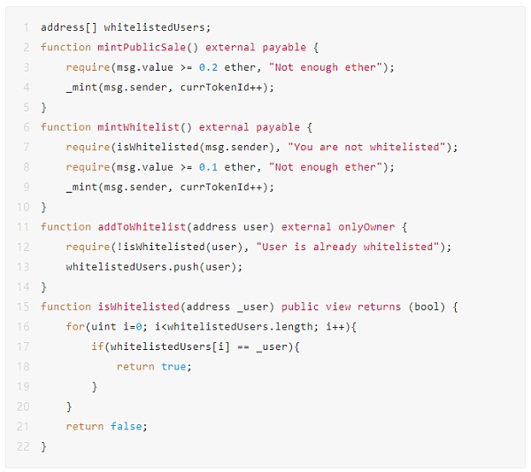 使用whitelistedUsers映射允许智能合约在一条指令中检查一个用户是否被列入白名单,而不是通过循环迭代。