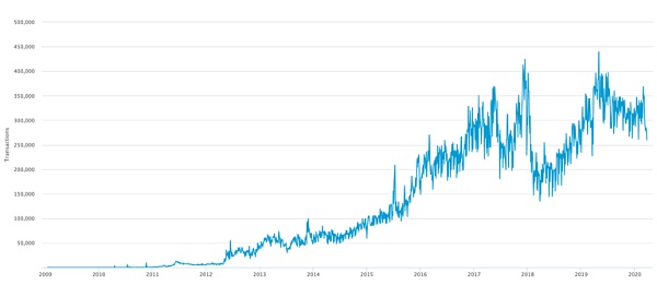 自2020年年初以来,比特币每日交易数量已从29500笔上升至最近的340000笔。