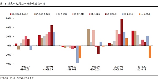 若单独观察美国股指表现的话,我们可以看到,它们在 80 年代的两轮加息以及 2015-2018 加息周期中表现较好,虽然在 1994-1994 年期间表现为负,但也只是小幅度的负回报。其他两轮周期中,表现基本持平。