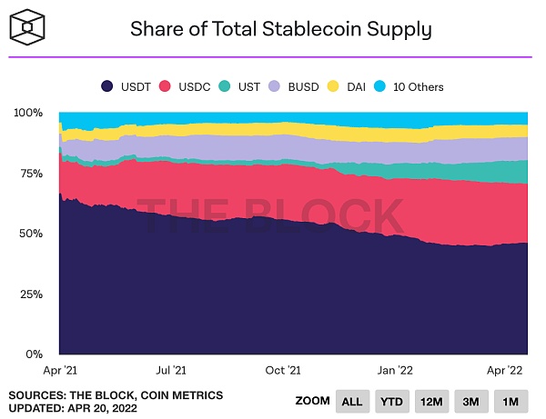 UST 的市场份额在过去两个季度急剧增长。该协议目前占稳定币总供应量的9.8%,比 2021 年 10 月以来的 2.1% 增加了 4 倍以上。如下图所示: