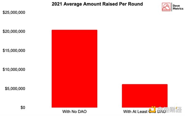 从投资金额上看,2021年传统加密VC(除开投资DAO之外)平均投资金额为2050 万美元,而投资DAO则为620万美元。