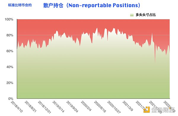 大户账户多头头寸自 722 下降至656,该数值创出近 108 周新低,上一次出现类似水平需要追溯至整整两年之前,空头头寸自1159 同步骤降至 230。大户账户最新统计周期内又一次进行了多空双向同步减持,不过需要注意的是,这类账户的净持仓再度回归净多状况之中,结束了此前连续三周的净空持仓。但是这种偏多态度的表达受制于多单持仓量创出 2020 年 3 月初以来新低的表现大打折扣,因此仅认为大户流露出了较弱的转多态度。