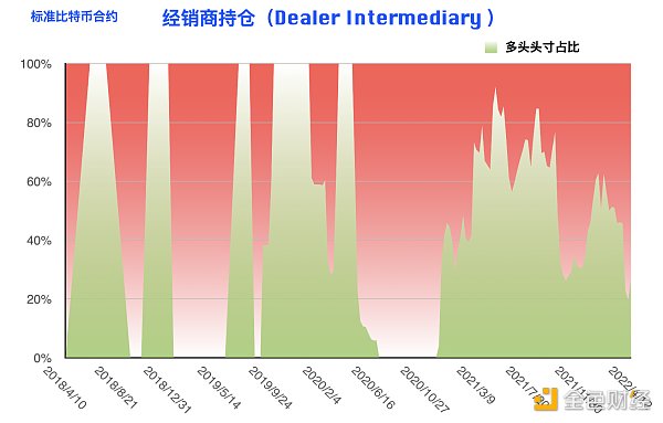 规模最大的经销商账户多头头寸自 345 上升至 406,空头头寸自 1393 下降至 1127,该数值上一统计周期的涨幅全数回吐并创出了近三周新低,与此同时多单持仓占比回升至 26.48% 创出近三周新高。规模最大的机构账户在最新统计周期内非常耐人寻味的净多调仓,考虑到这类账户在过去一段时间里一直在进行偏空的仓位调整,而最新统计周期市场出现了大幅回调,「常理」来看这类账户「理应」顺势加大空单布局力度,但是这种颇显意外的调仓非常值得重视。大型机构对于市场的宏观判断能力在相当长的时间里已经得到了反复验证,所以这或许可以视作是一个阶段止跌拐点到来的先兆信号。