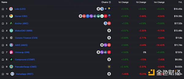 DeFi项目锁定资产前十排名及锁仓量 数据来源:defillama