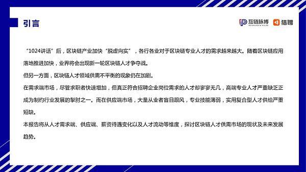 报告从人才需求端、供应端、薪资待遇变化以及人才流动等维度,探讨了区块链人才供需市场的现状及未来发展趋势。