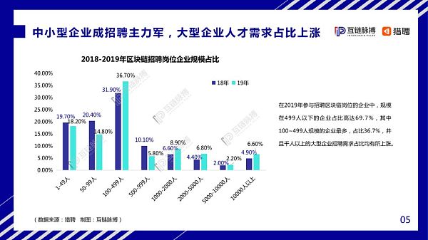 报告显示,中小型企业是招聘主力军,大型企业人才需求占比上涨。根据猎聘大数据,在2019年参与招聘区块链岗位的企业中,规模在499人以下的企业占比高达69.7%。其中10-499人规模的企业最多,占比36.7%。此外,千人以上的大型企业招聘需求占比均有所上涨。