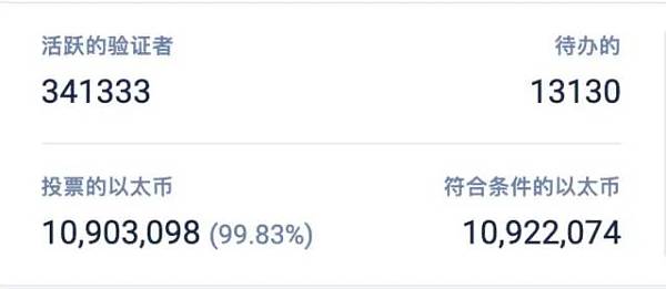 截至4月12日,信标链运行平稳。链上数据显示,信标链已拥有34.13万个节点,累计质押总额约1090.46万ETH,其中有效投票参与率达99.84%。自2021年10月15日至今,节点数量和质押总额稳步增长,每日验证者收入也在缓慢增长中。