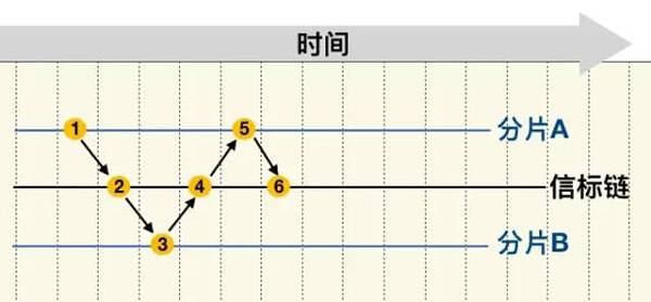 具体来看:当分片1向分片2发出消息时,分片1会将相关信息打包到它的区块头中。等待信标链将分片1的区块头打包到新的区块中,信标链完成区块共识后,分片2会接收到信标链广播的包含分片1区块头的信息。在此之后,分片 2 会验证关于 分片 1 的信息然后开始执行相关操作,并将执行完成的区块信息发送给信标链。