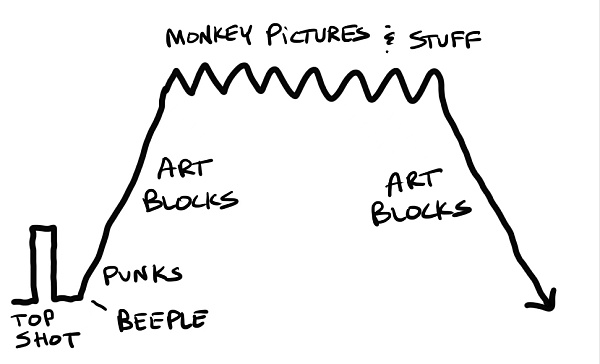 这一波的NFT泡沫由NBA TopShots球星卡燃起火种,然后远古的CryptoPunks涅槃,Beeple天价拍卖一锤定音,接力棒传递到Art Blocks手上之后彻底点燃了大众市场,最后市场找到了主体叙事:由BAYC所代表的pfp 10k故事会。最后的最后,元宇宙为这些故事会插上了想象的翅膀。
