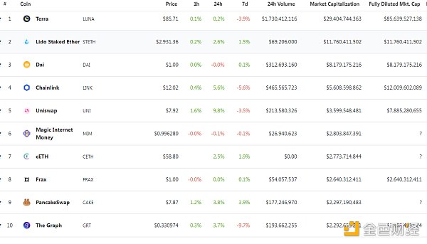 DeFi项目锁定资产前十排名及锁仓量 数据来源:defillama