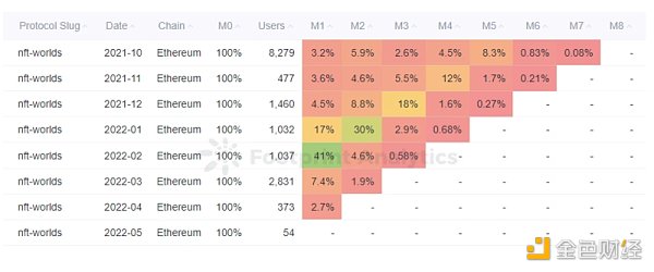 NFT Worlds 每月新增用户的数据表现并不是非常拔尖,上线第二个月开始每月新增用户相对保持在约一千人左右。主要变化与 NFT Worlds 的交易变化一致。 用户留存表现也较为平庸,每月的留存均较低。