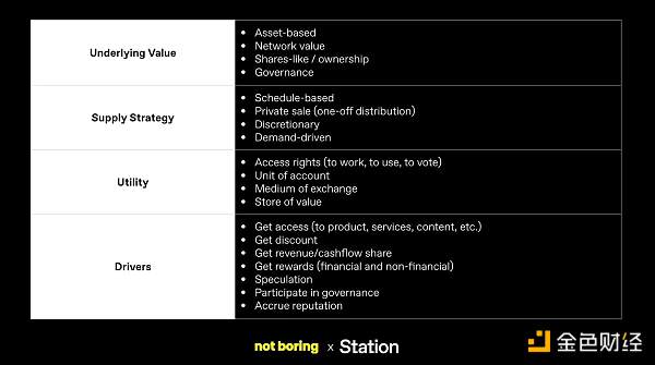 基础价值:代币的价值是什么?它是让持有者投票,还是拥有网络,或者赋予他们对特定资产的权利?一个协议可能有多个代币,这些代币具有不同形式的基础价值。