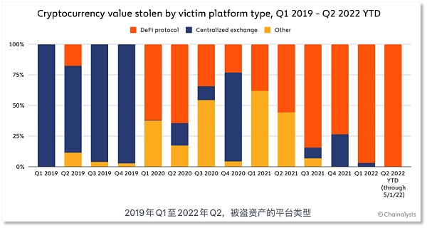 Chainalysis指出,从2020年初以来,在所有加密货币平台被盗的资金中,DeFi 协议所占的份额就在不断增长,并在2021年损失了绝大多数的被盗资金。截至 5 月 1 日,2022 年被盗的16.8亿美元加密资产中,DeFi 协议占到了97%。?