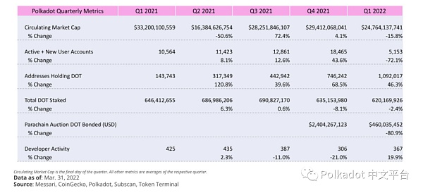 在 2022 年第一季度,Polkadot 的估值变化与其他生态系统的变化一致。LUNA 涨幅最大,为 + 18% ,FTM 跌幅最大,为 -38% ,Polkadot 跌幅第三,为 -19% 。