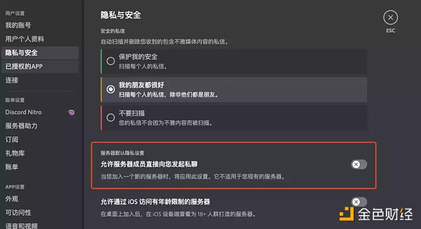 该选项如果打开的话,Discord 的成员可以直接向你发起私聊,而这些成员的头像以及账号也许会与你在 Discord 里看到的管理员一模一样,这时你也许就会放松警惕而轻信这个账号,所以当他们发送某个链接给你的时候也许你就被钓鱼成功了。