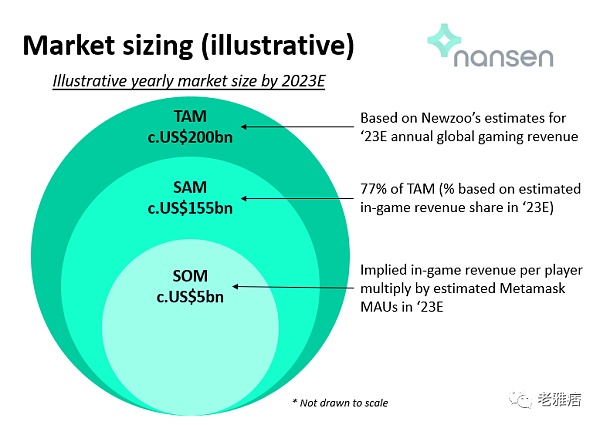 将每个玩家的隐含游戏内收益与2023年Metamask?MAU的估计范围相乘,我们可以得出到2023年,每年可获得市场规模为10亿至50亿美元,玩家基数约为20-100万