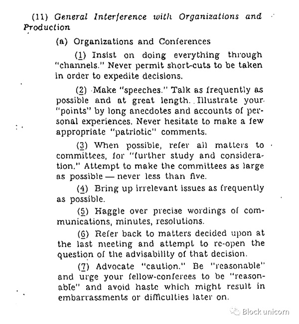 CIA(美国中情局)编写了一本引人入胜的手册,名为《简单破坏现场手册》。除了关于生火、瞄准仓库、破坏工具和堵塞厕所的详细提示和技巧外,该手册还包括一个关于破坏组织工作的完整部分。该手册描述了领导不明确和缺乏行动偏见的组织的失败状态: