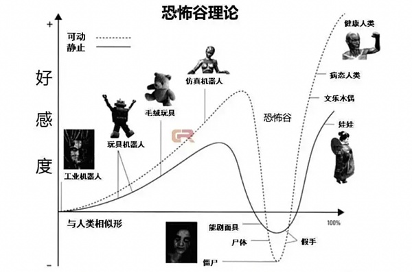 1970年,日本机器人专家森昌弘提出恐怖谷理论,由于机器人与人类在外表、动作上相似,所以人类会对机器人产生正面的情感。当机器人与人类的相似程度达到一个特定程度的时候,一点点的差别都会显得非常刺目,并带来负面和反感情绪。而当机器人与人类的相似度继续上升,人类对其情感会再度回到正面。