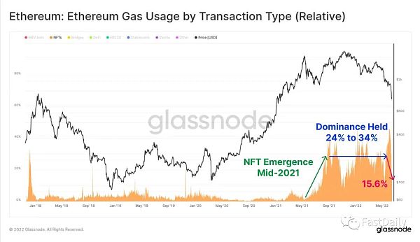 在以太坊生态系统的许多方面,需求状况一直在减弱,一般应用的使用率在下降,而在2021年11月的ATH之后,网络拥堵情况有所缓解,最近几周,NFT市场的冷却变得很明显。