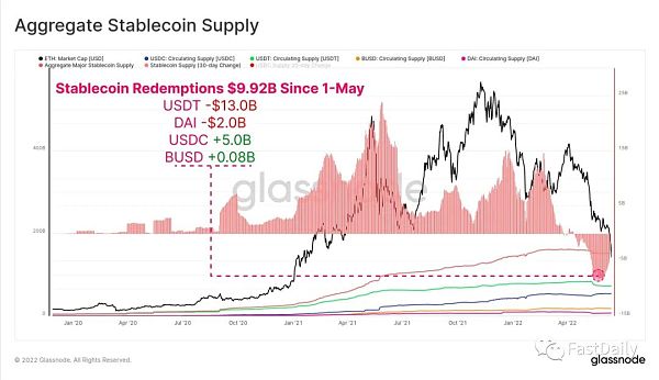 自5月初以来,稳定币赎回总额为99.2亿美元,资本从市场流出。USDT的赎回量最大,为-130亿美元,其次是DAI,为-20亿美元,因为投资者关闭了通过MakerDAO金库获得的杠杆(或被清算)。有趣的是,自5月1日以来,USDC的供应量增加了50亿美元,这表明市场的偏好可能从USDT转向USDC,成为最受欢迎的稳定币。