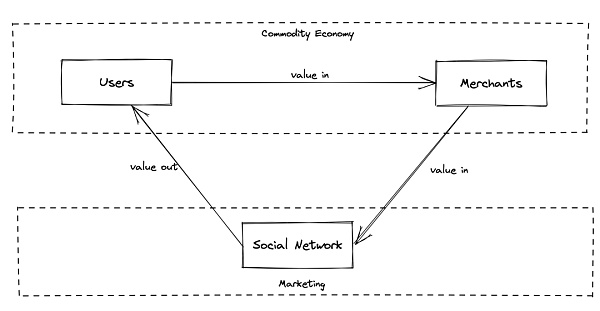 我将当前社交网络的这种特性称为寄生性,即社交网络是寄生在一般市场经济上的。寄生性主导的社交网络必须起到加速商品市场流通的作用,而非只关注用户的需求。用户是真正的价值来源,但是完整的价值流动被社交网络的寄生性掩盖了。
