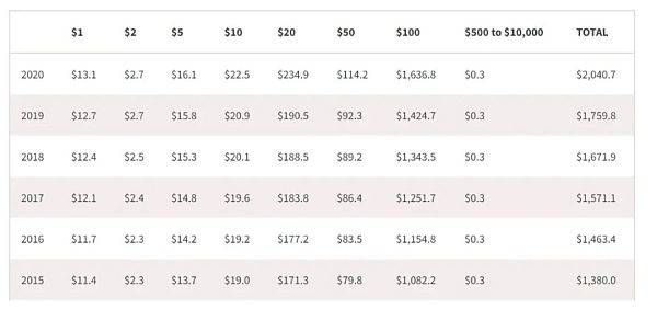 图 3. 2015 - 2020 年美元纸币流通量(来源)